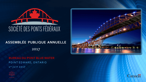 FBCL a tenu son assemblée publique annuelle 2017 à 15 h, le jeudi 1er juin 2017 au bureau du pont Blue Water situé au 1555, Venitian Boulevard à Point Edward en Ontario. Voir la présentation