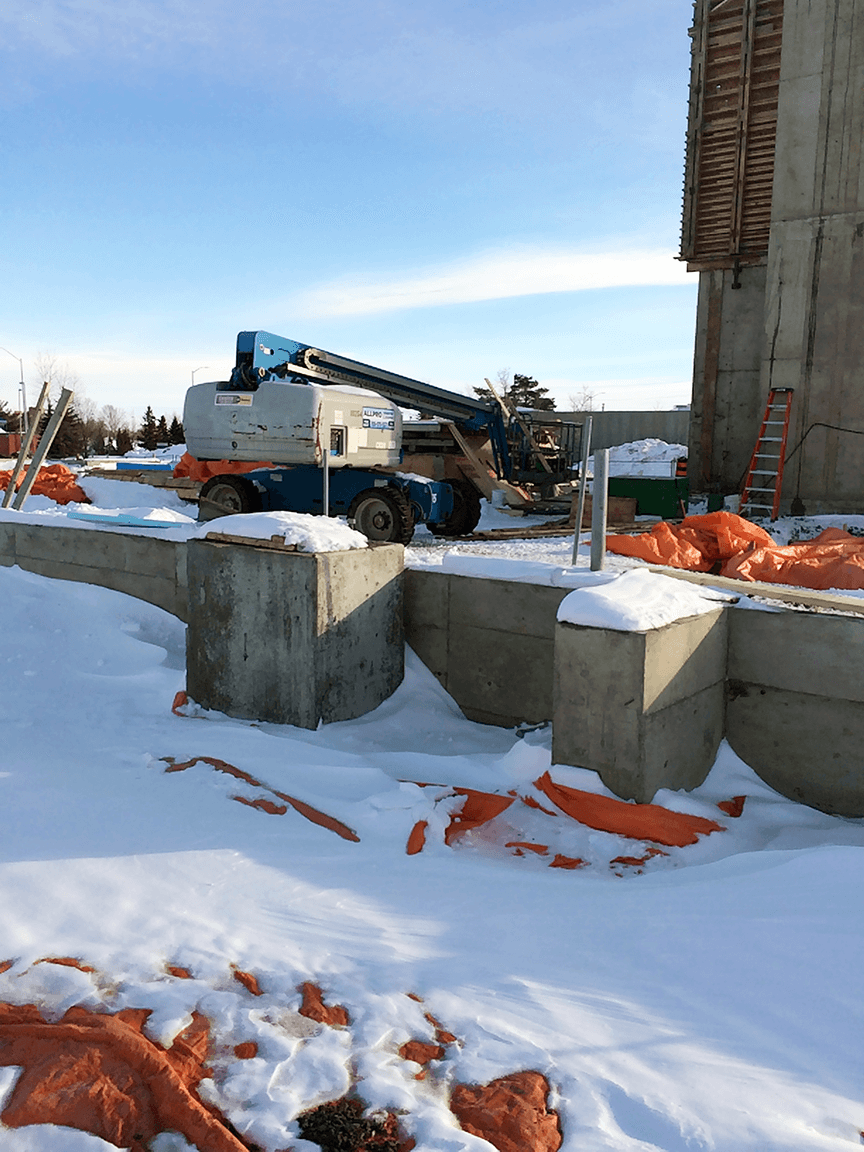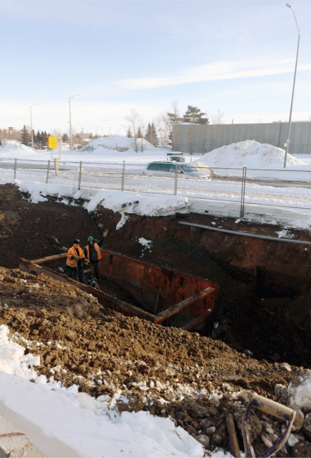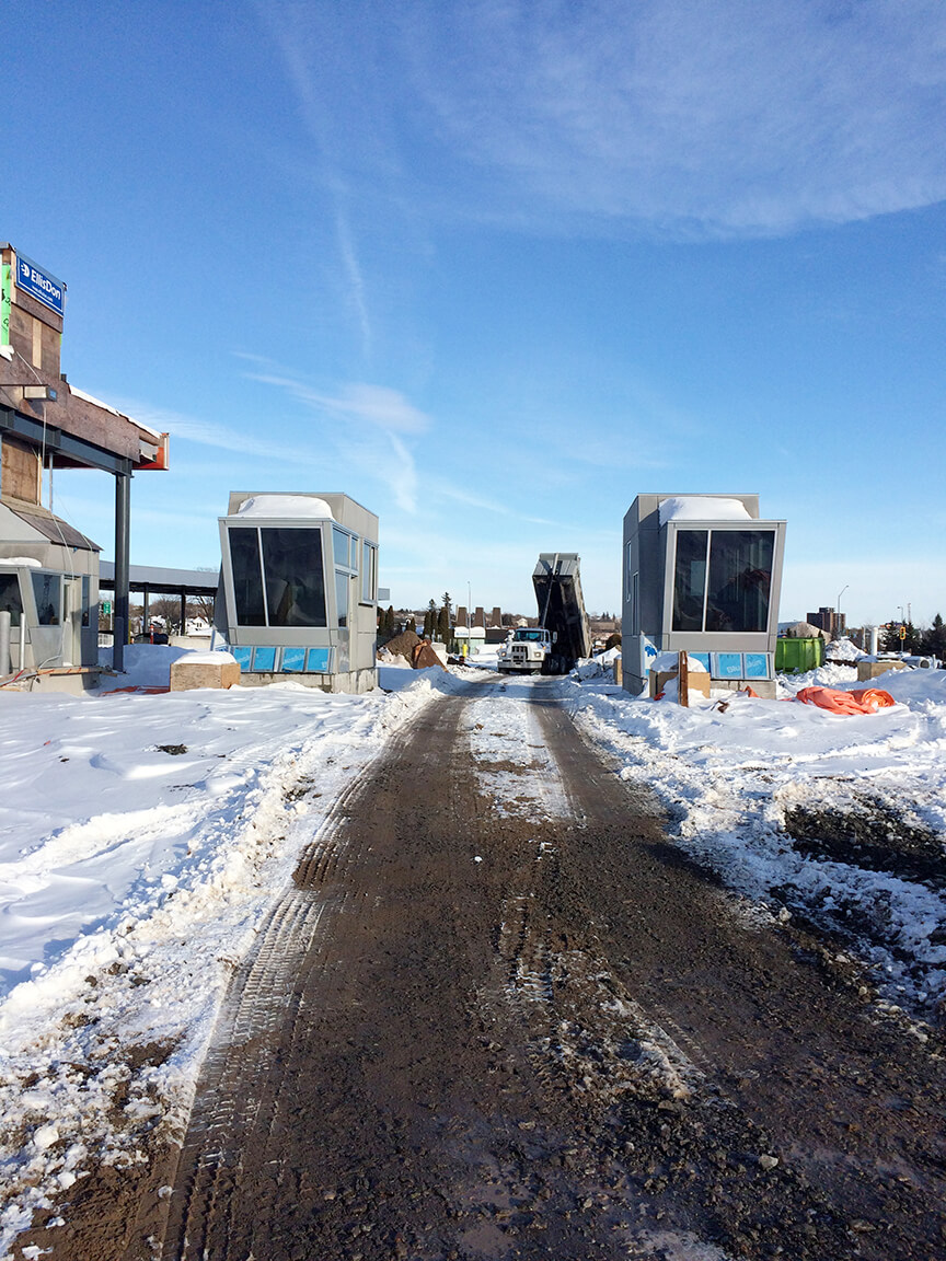 Vue des nouveaux postes à deux étages (en haut à gauche), travaux d’excavation en cours pour l’installation principale (en haut à droite) ainsi que les cages d’escaliers et fondations du bâtiment commercial en construction (en bas).
